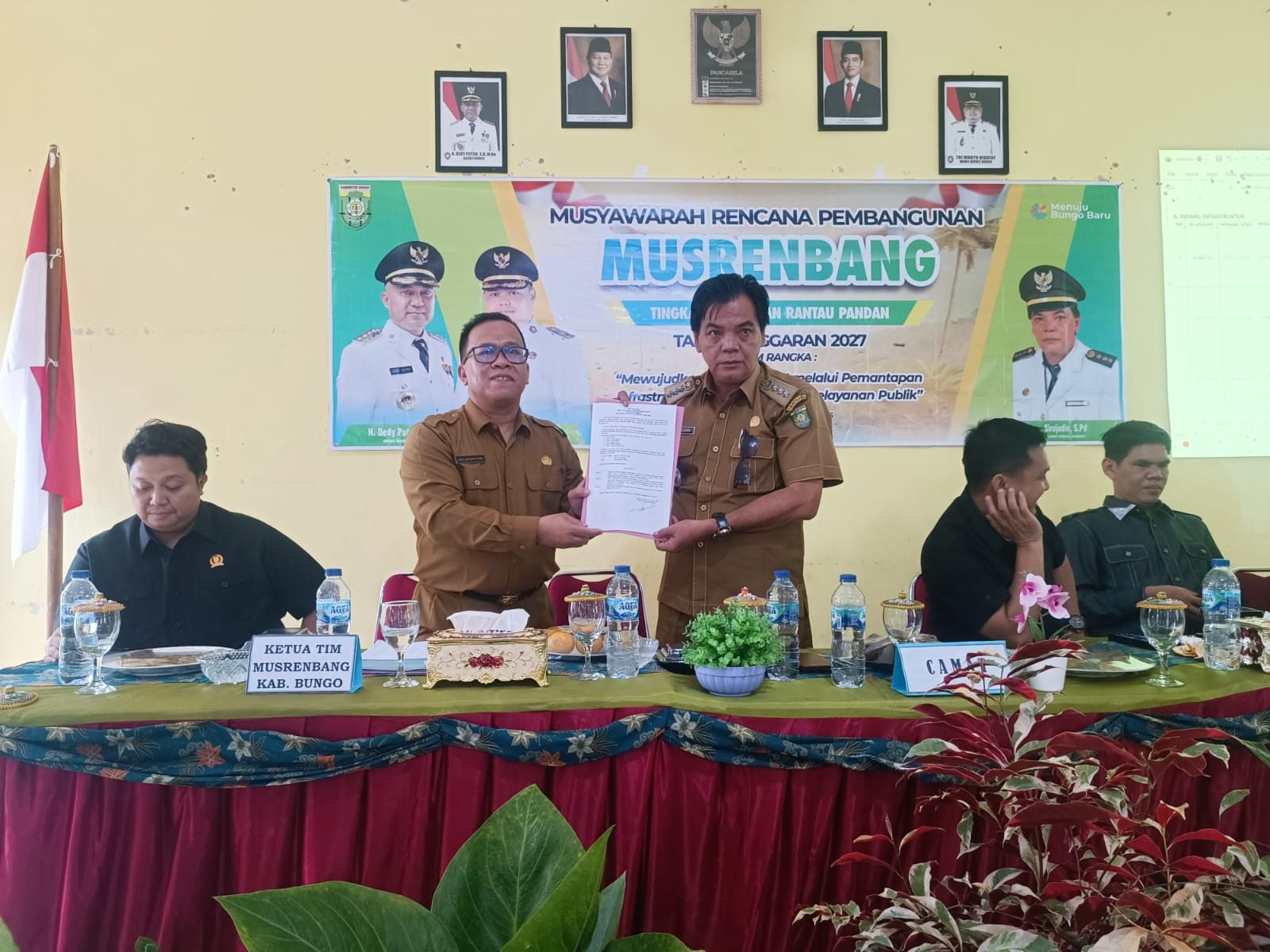 Di penghujung kegiatan Musrenbangkec, Camat Rantau Pandan secara resmi menyerahkan Berita Acara Hasil Musrenbangkec dan Daftar Usulan Prioritas Kecamatan Rantau Pandan kepada Dr. Auri Adham Putro, S.Sos., M.Si.